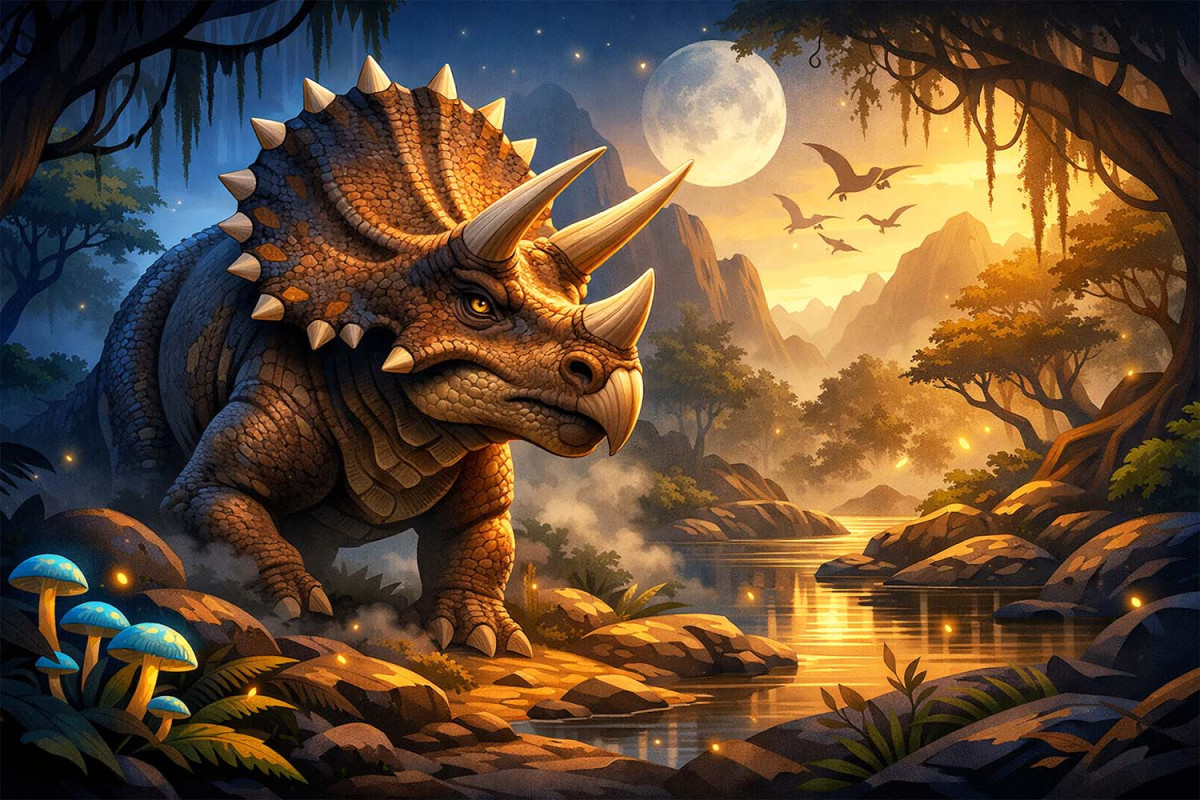 Уяви собі динозавра розміром зі слона, який мав три великі роги на голові та величезний кістковий комір, схожий на щит! Трицератопс був одним з найвпізнаваніших динозаврів, який жив у той самий час, що й Тиранозавр Рекс, і часто ставав його здобиччю або супротивником у боротьбі за виживання. Цей травоїдний гігант мав неймовірну зброю для самозахисту та жив великими стадами, що нагадували сучасних слонів чи носорогів. Готовий дізнатися, як це дивовижне створіння виживало у світі, повному небезпечних хижаків, та які секрети воно приховує під своїм кістковим обладунком?