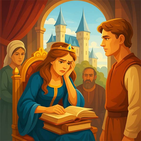 Прийшов до палацу. Його відразу повели до королівни. Сидить вона на троні, горда, як ясна зоря, а довкола – придворні, пані, вельможі.