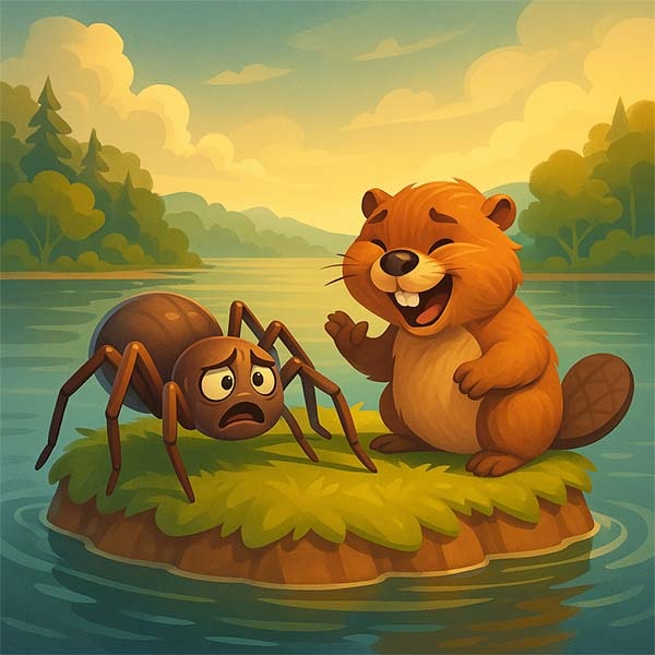 Одного теплого літнього дня Павук неквапливо прогулювався берегом річки. Сонце блищало у воді, вітерець гойдав очерет, і все довкола було тихо-тихо. І раптом він побачив – просто на піску солодко спить маленьке бобреня.