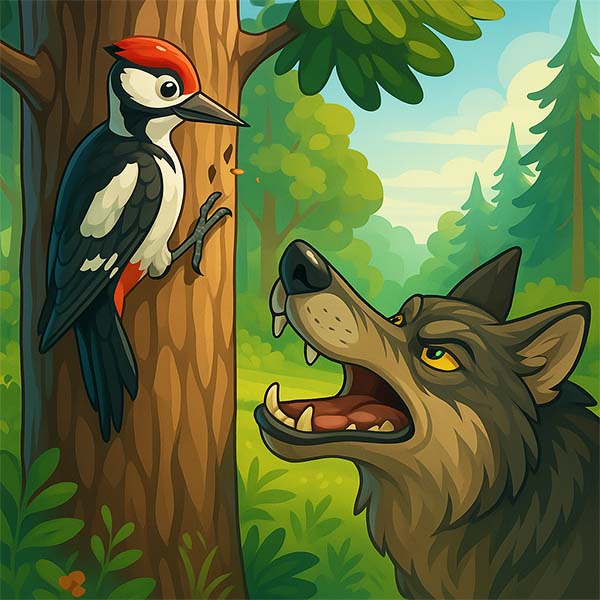 Вовк розкрив рота, а дятел одразу й опинився в його животі.
