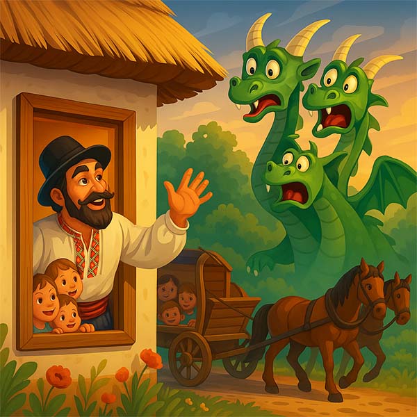 Почув змій галас циганчат, злякався та й думає: "Старий циган дужий, а ще як ті діти такі будуть, то мене заб’ють". Кинувся змій навтікача, аж небо загуло. Забув навіть про коней та воза.