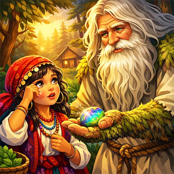 – Не бійся мене, дитино. І плакати годі. Не тривож даремно душу материнську гіркими сльозами, їй від того важко. А щоб тугу твою розвіяти, ось, візьми цей камінець. Він не простий, а чарівний: тільки-но глянеш на нього – одразу горе забудеться, і серце заспокоїться.
