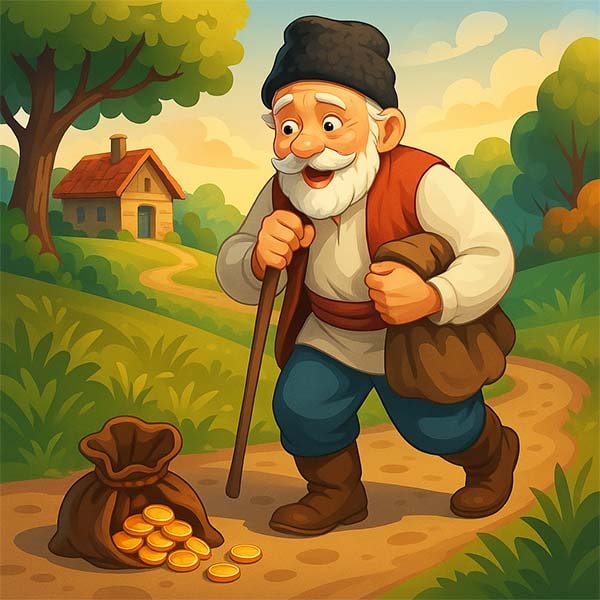 Повернувся дідусь, іде додому. Бачить: лежить на дорозі торбина. Підняв, розв’язав її, а там – повно грошей. Видать, їхав якийсь панисько і загубив. Узяв дід торбу з грошима під пахву і пішов додому.