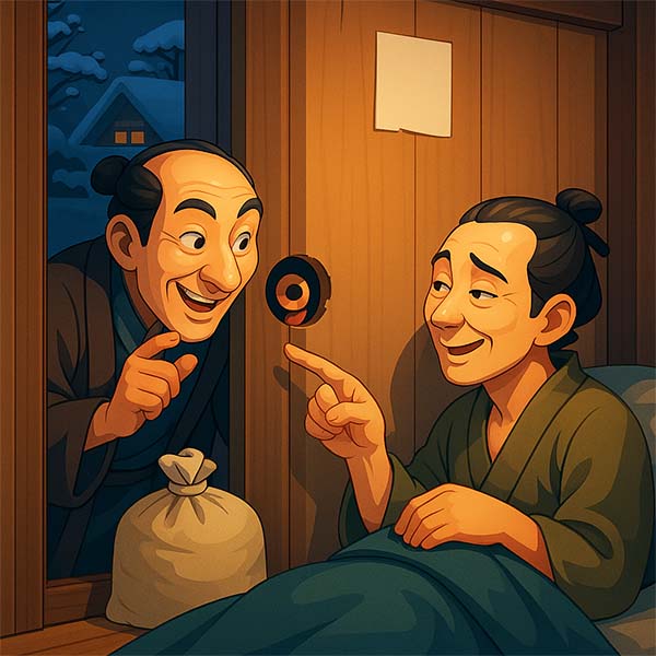 Торговець здивувався: щойно ж розмовляв із господарем, і раптом – його "нема". Стоїть біля дверей, не знає, сміятися чи сердитись. А тоді провів рукою по стіні з паперу – по сьодзі. Водив-водив... аж поки не зробив пальцем дірку. Заглянув – і справді: господар у хаті! Лежить собі на теплому матрацику, відпочиває, мов нічого й не сталося!