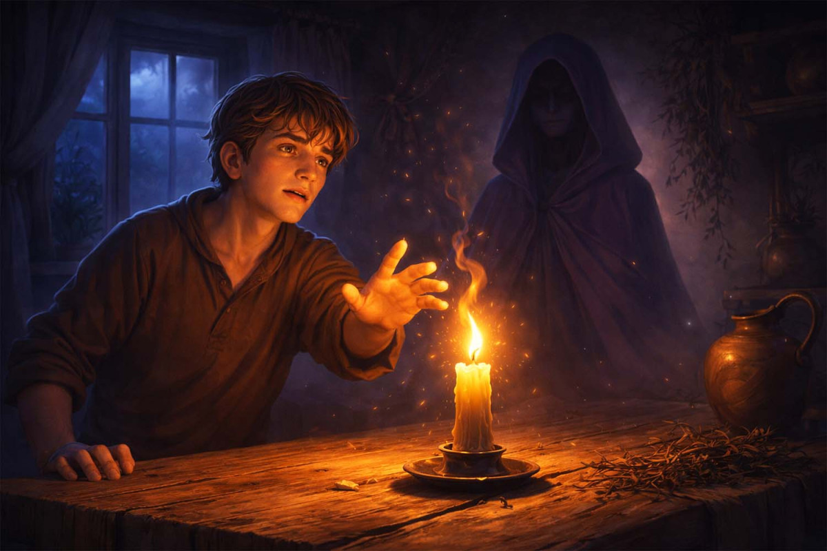 Поклала гостя на стіл перед парубком дві свічки. Одна була товста, з жовтого воску, важка і надійна. Гніт у ній ледве жеврів, даючи слабке, рівне, але сумне світло. Воно не гріло, лише розганяло морок. Друга свічка була тоненька, витончена, але палала вона, як смолоскип! Вогонь ревів, танцював, розсипав іскри, освітлюючи кожен куток хати яскравим, сліпучим сяйвом.