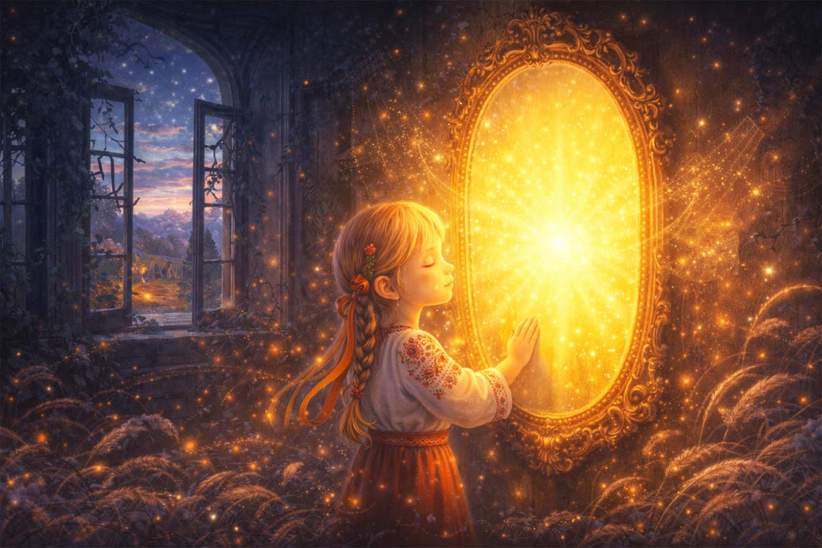 Дзеркало не розбилося, не потемніло. Воно просто світило, як маяк. І зрозуміли люди, які прибігли на те сяйво: дзеркало не було злим. Воно було чесним. Воно лише віддавало те, що люди приносили з собою. І тільки той, хто носить сонце всередині, не боїться зазирнути у вічі правді.