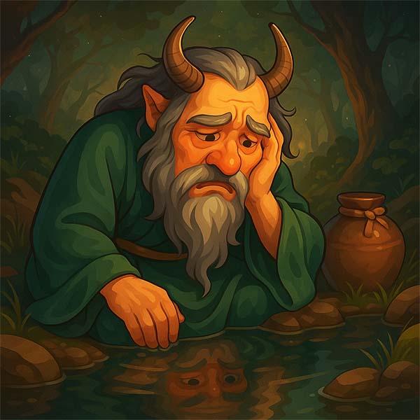 Обійшов він хати, оглянув поля та й вийшов до дзвінкого струмка. Сів на березі перепочити, милується красою. І треба ж було такому статися – зазирнув Гірський Бог у воду, та й побачив там своє відображення!