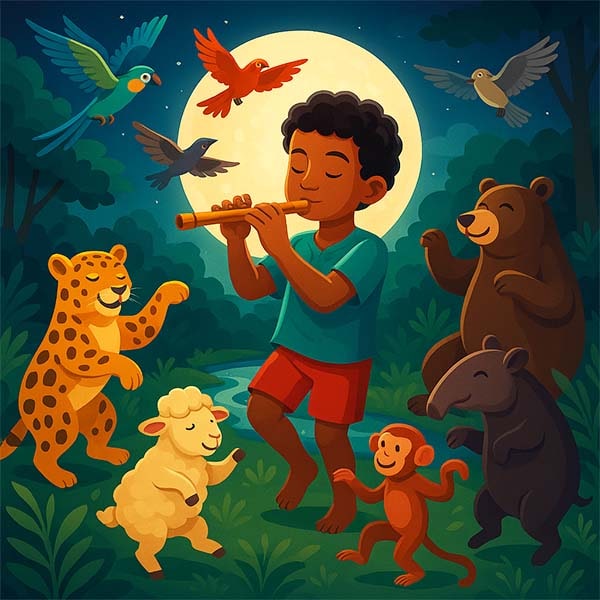 Коли звірі вийшли з лісу, навколо вже було тихо. Не було ні хлопчика, ні баранчика – тільки самотня дудочка лежала біля струмка й тихо блищала у місячному світлі.