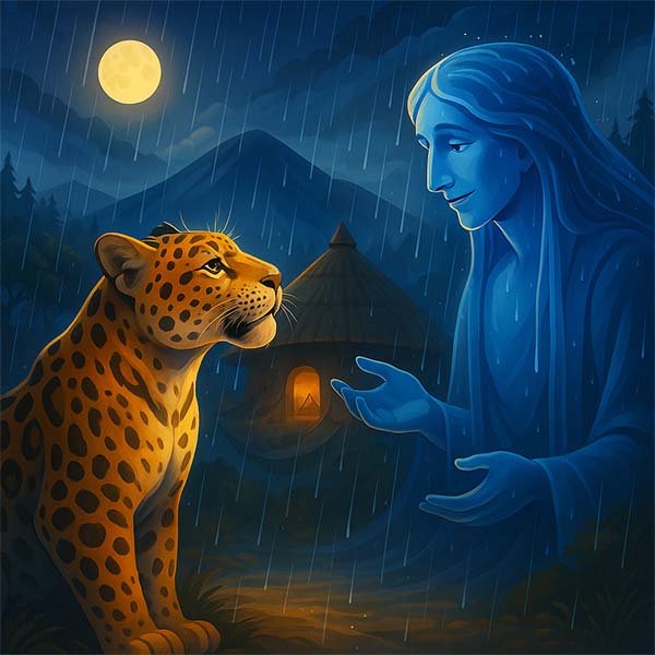 А неподалік тихо блукав ягуар. Великий, плямистий, мов сама ніч із іскрами, він наблизився до малоки й раптом зустрів Дощ, що неквапно ішов із гір.