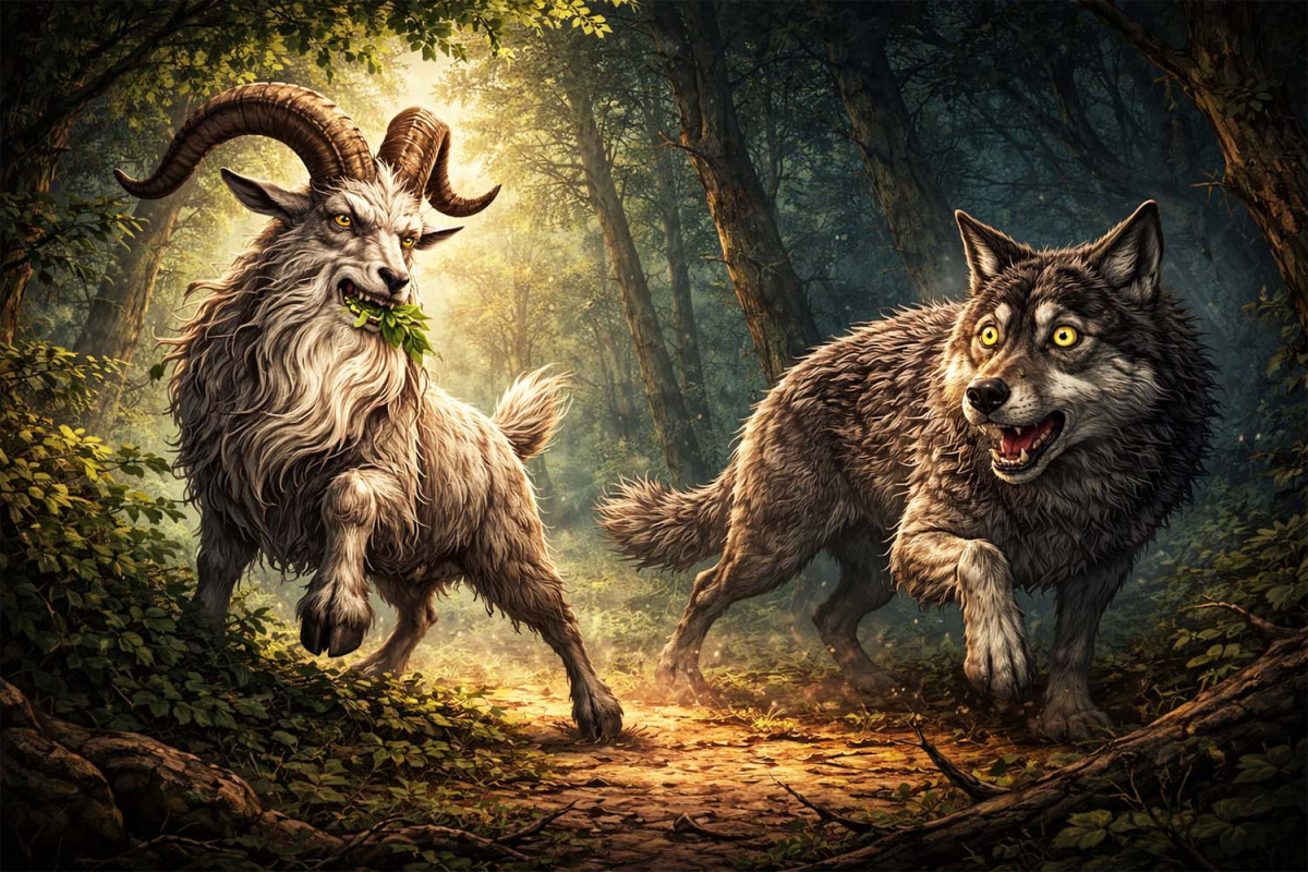 Пішов якось старий бородатий цап у ліс погуляти, молодого листячка на кущах поскубти. Зайшов у самісінькі хащі, аж раптом гілля гучно затріщало, і виходить йому назустріч величезний сірий вовк – сам вовчий отаман. Очі жовтим вогнем горять, гострі зуби клацають, а на морді хижа посмішка грає.