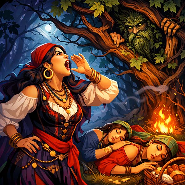 І тут прокинулася в ній ромська лють. Схопилася хвацька молодиця на ноги, вперла руки в боки та як почне Лісовика сварити! І сяким його назвала, і таким, і всіма словами, що знала, припечатала: