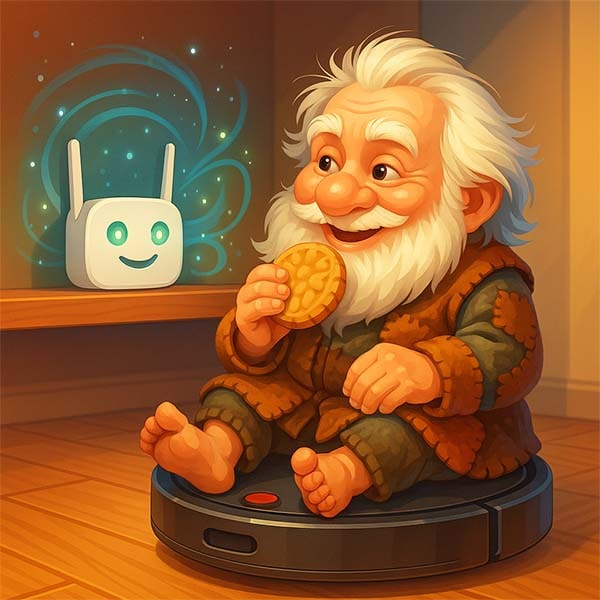 Дочекався Домовик, поки господарі, втомлені та знервовані, ляжуть спати, і вирішив діяти. Підійшов він до роутера – тієї самої коробочки з ріжками, що сумно блимала червоним вогником.