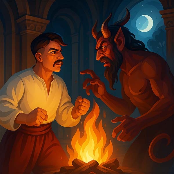 Переночував і другу ніч. Пішов уже й на третю ніч ночувати. Розпалив огонь, аж приходить рогатий, з довгою бородою чортисько та й каже: