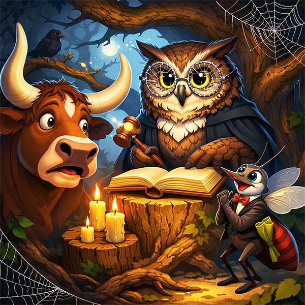 Сова, поправивши окуляри з павутиння, довго вдивлялася в Комара, потім у Вола, якого довелося викликати повісткою (її принесла сорока). Віл стояв під дубом, переминаючись з ноги на ногу, і не розумів, чого від нього хочуть уночі.