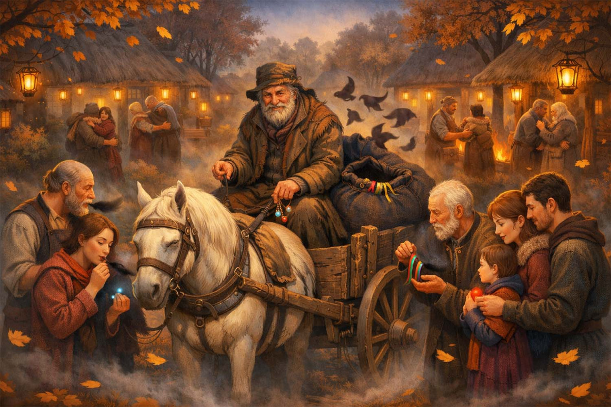 Одного похмурого осіннього вечора у село заїхав дивний віз, запряжений сліпим конем. На возі сидів сивий дідусь у латаній свитці, з очима хитрими й пронизливими. Він зупинився посеред майдану, розв’язав величезний, чорний, як ніч, мішок і гукнув: