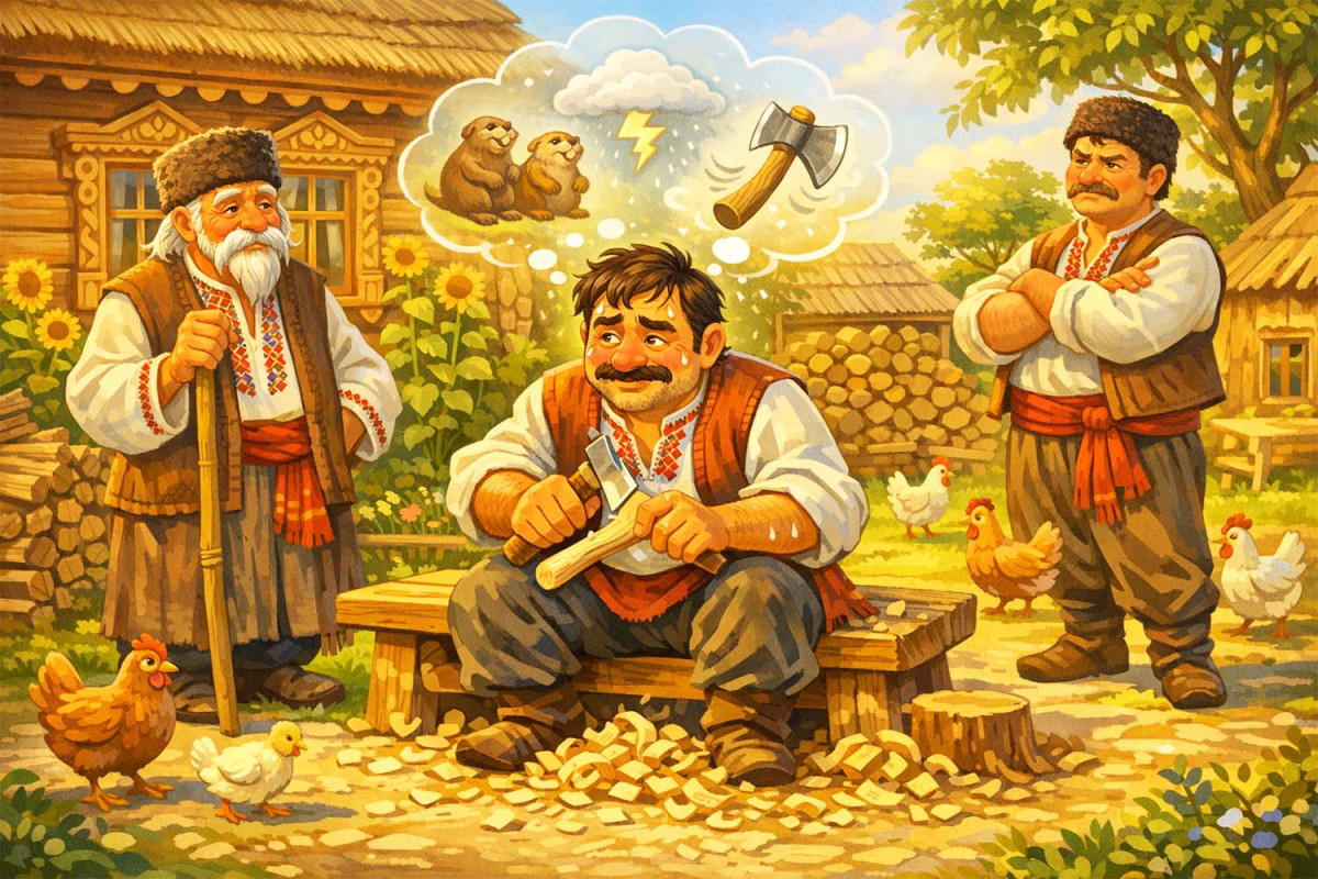 – Ти, чоловіче, бачив, як ті чари діяли. Тож бери оце дерево, сідай на ґанку і "чаклуй" над ним ножем доти, доки воно не стане новим, міцним топорищем. А як не зробиш до вечора – посаджу в яму за наклеп.