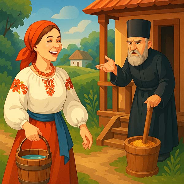 – А ви чого сюди, попе, зайшли?.. Ану, жінко, принось чвертку проса і ступу в хату.