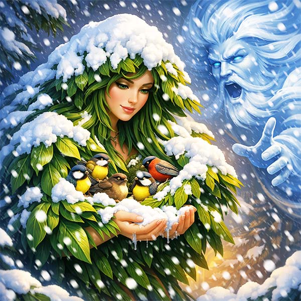 Випросталася Сосна, струсила снігову шапку і зрозуміла, що врятована. З того часу вона назавжди залишилася в цьому вбранні. Її голки не бояться морозів, а гілки не ламаються під снігом. І хоч вона втратила своє шовкове листя, натомість отримала дар вічної зелені та велику честь – бути зимовим прихистком для тих, хто потребує тепла.