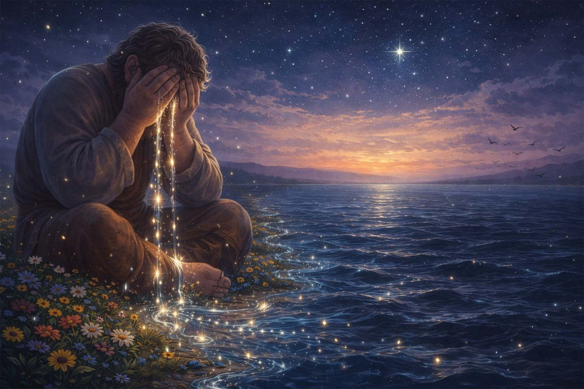 Його сльози були важкими, мов каміння, і гарячими, мов його біль. Вони текли спочатку струмками, потім ріками. Вода прибувала день за днем, рік за роком. Солоні сльози заливали розкішні сади, поглинали ліси, топили зелені луки.