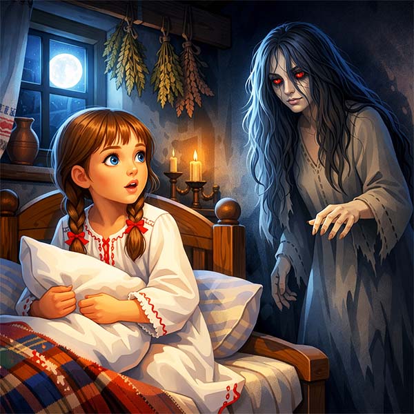 Однієї ночі, коли повний місяць залив кімнату срібним молоком, побачила Оленка дивну гостю. З темного кутка, де висіли пучечки сухого звіробою, випливла тінь. Була вона схожа на маленьку жінку, сіру, як попіл у печі, з довгим волоссям, що плуталося, мов павутиння. Очі в неї були великі, сумні й безсонні.