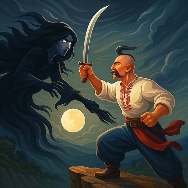 Узяв свого вірного коня – ворона Чумака, осідлав його, взяв шаблю, загартовану в блискавці, а до серця – молитву матері. Попрощавшись з селом, рушив у нетрі, де темрява була така густа, що навіть власного дихання не чути.