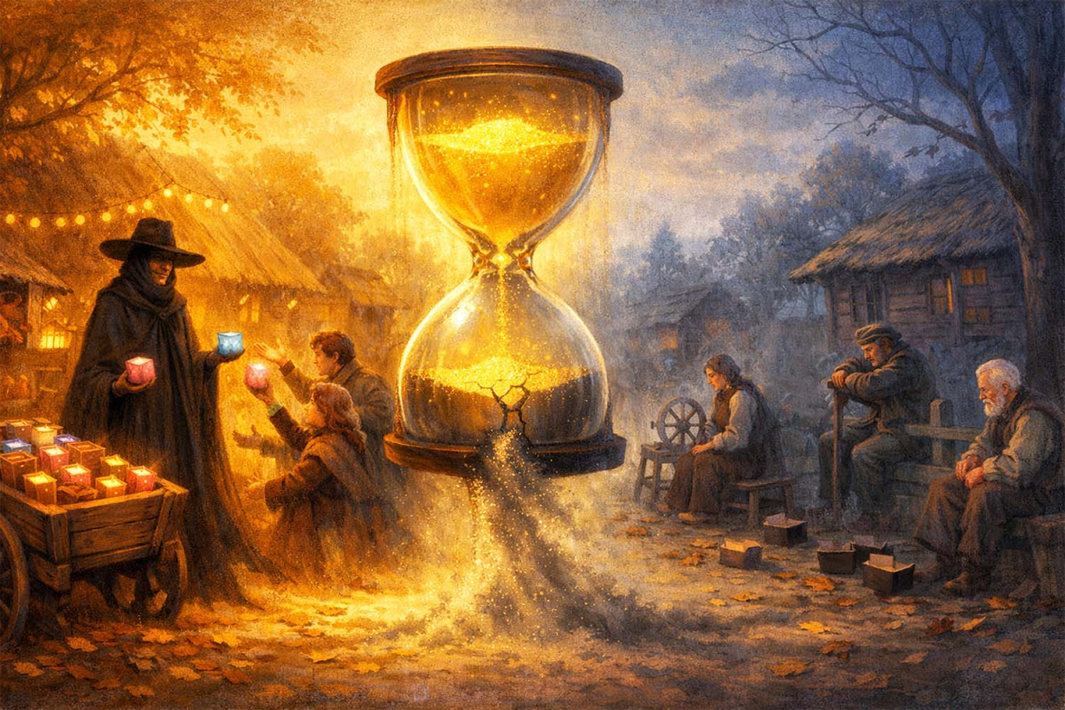 – Підходьте, люди добрі! – гукав він солодким, заколисливим голосом. – Продаю найцінніше! Те, що знімає тягар із плечей і заспокоює душу. Продаю час і надію!