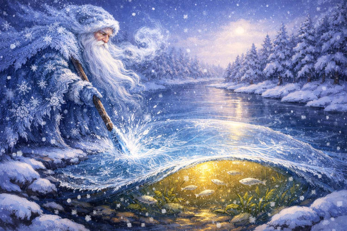 Розгнівався Мороз, дмухнув з усієї сили, вдарив палицею по хвилях. Верхній шар води миттєво побілів, затвердів і перетворився на товсту, прозору кригу. Мороз засміявся, задоволено потираючи руки, бо думав, що переміг і скував Річку назавжди.
