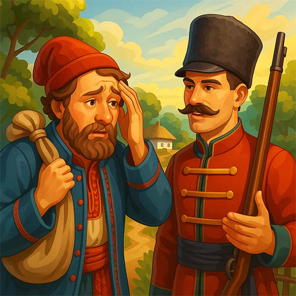 А на краю села стояв на посту солдат. Пішов купець до нього і розказав про свою біду. Вислухав солдат купця та й каже: