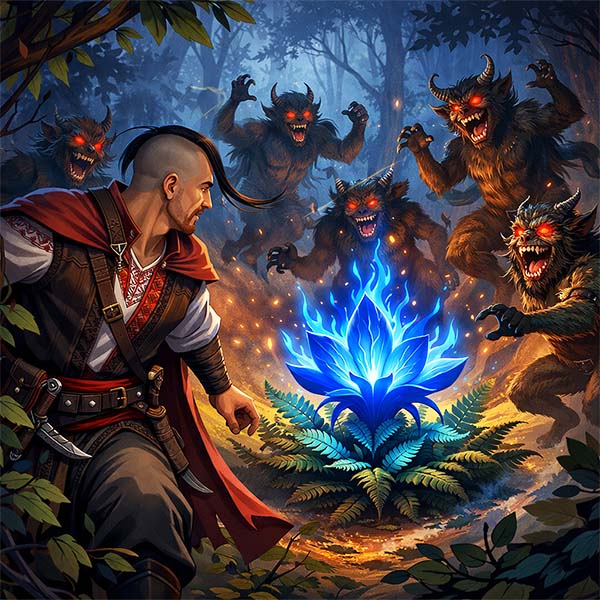 Там, посеред галявини, оточена мороком, цвіла вона. Квітка палала синім, холодним вогнем, пульсуючи, наче живе серце. Але довкола неї, сплітаючись у дикий танок, вили та реготали чорти. Були вони кудлаті, з палаючими очима, і шкіра їхня віддавала болотною тванню.