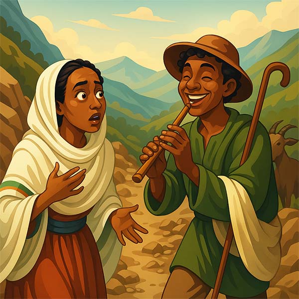 Тут назустріч їй вийшов пастух із сопілкою в руках. Він подивився на неї й каже лагідно: