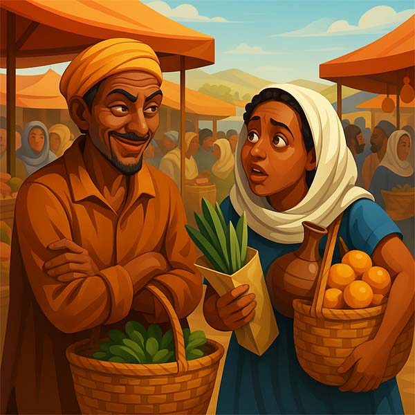 – Добрий чоловіче, постережи, будь ласка, мою корзину. Я вже півбазару обійшла, руки мені просто відтяло. І як це я, дурна, не подумала, що самій із такою ношею не впоратися?