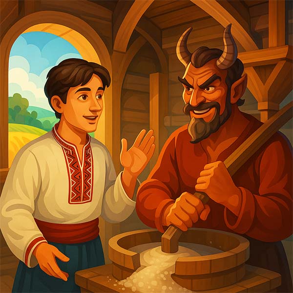 Батько пустив. Іде Салимін, іде – аж бачить: стоїть млин, а в ньому чорт меле.