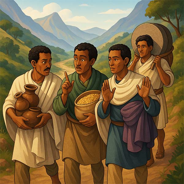 Четверо чоловіків з однієї гірської оселі вирушили до далекого міста – на великий базар. У кожного були свої справи: один купував зерно, другий – тканину, третій – посуд, а четвертий, найбідніший серед них, придбав кам’яні жорна для домашнього млина. Важка то була ноша – аж плечі йому боліли, але він терпів і ніс.