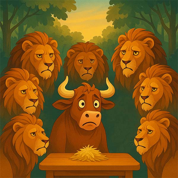 Жили-були собі сім левів. Одного дня вони вирішили завести собі друга – і незабаром познайомилися з одним биком. Спочатку леви влаштували бенкет і запросили свого нового товариша. На столі з’явилася гора свіжого м’яса – усе найсмачніше, що тільки можна було знайти. Леви їли і пригощали, а бик, хоч йому м’ясо й не припадало до смаку, намагався не показувати цього і весь час дякував за гостинність.