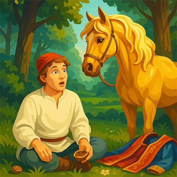 Тоді Запічник розколов третій горіх – свій власний. І сталося диво: перед ним з’явився золотий кінь, а на землі заблищали шати справжнього королевича.