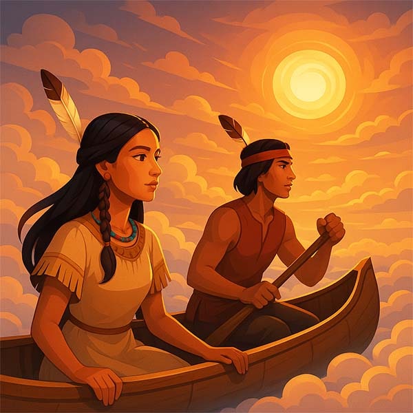 На березі зібралося все плем’я – чекали, як хоробрі юнаки намагатимуться обігнати Сонячну Квітку. Але ось, коли дівчина вже сиділа в човні, а перший воїн приготувався до старту, по річці приплив ще один – незнайомий юнак. Його каное було легке, мов промінь світанку, а очі – глибокі, як небо після дощу.