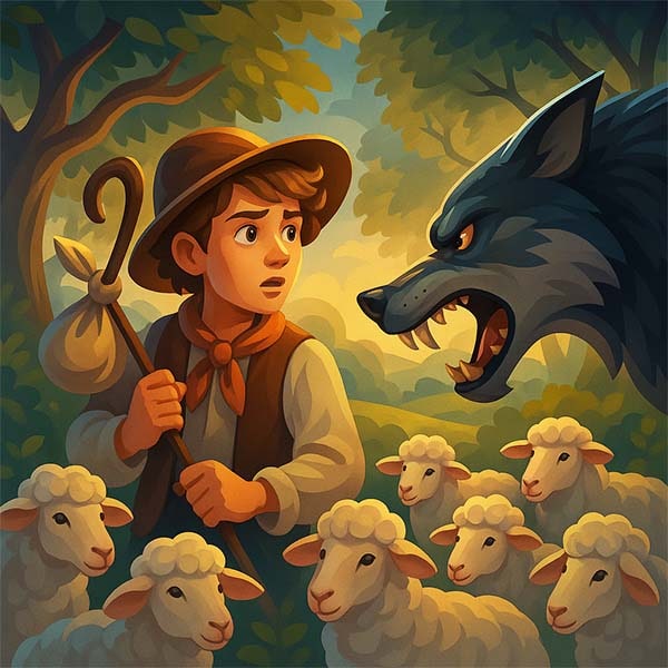 От узяв пастушок вузлик з харчами та й пішов у поле з овечками. Аж раптом, звідки не візьмись, з’явився вовк.
