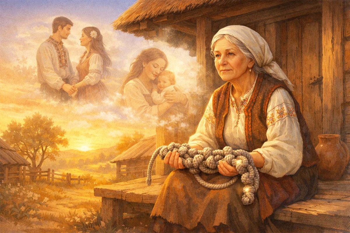 – Це не проста вервечка, – проскрипіла баба. – Коли серце твоє краятиметься від туги, зав’яжи на ній вузол. Разом із вузлом зав’яжеться і твій спогад. Біль зникне, наче його й не було. Але пам’ятай: розв’язати не можна.
