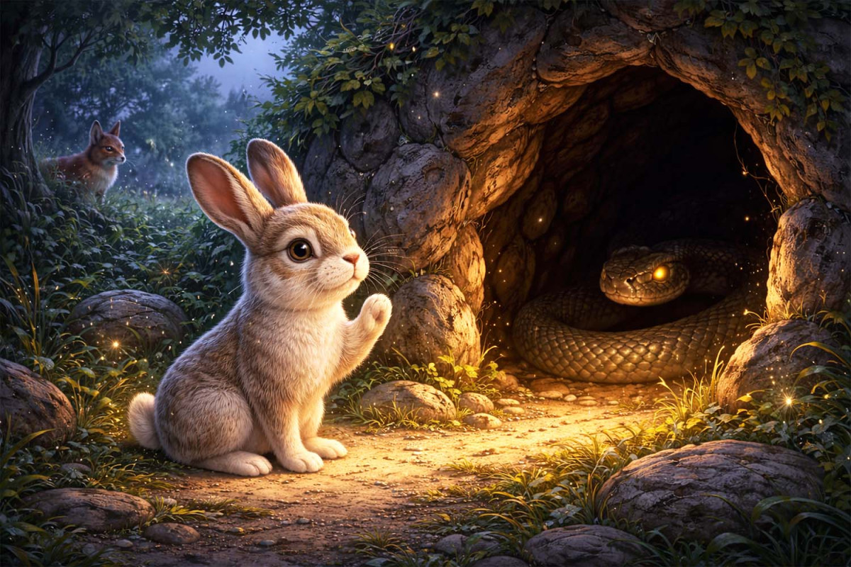 Злякався вухань. Тікати! Але куди? І він прожогом кинувся до найближчої печери. Та бідолаха й гадки не мав, що там на нього чигає інша небезпека – у тій темній прохолоді оселилася Змія.