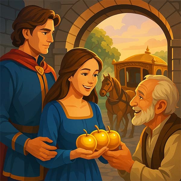 А старий купець саме сумував, що люба його доня безвісти зникла. Та раптом ворота відчинилися, і в’їхала золочена карета. З неї вийшла Метте поруч із молодим принцом. Простягла батькові три золоті яблука й сказала: