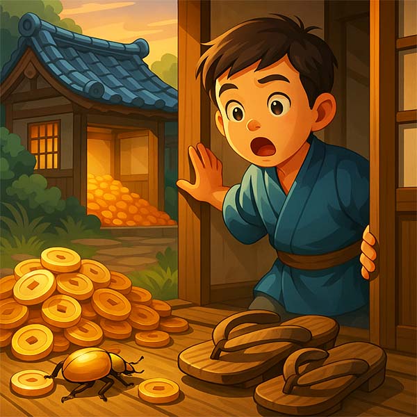 Повернувся Ґенкіті додому, взув сандалі, ступив – і з-під ніг посипались золоті монети. Купив він ліки, врятував батька, й Юкі більше не знала голоду.